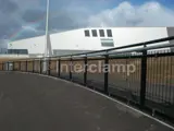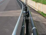 Pipe clamp fittings used with DDA Assist handrailing and mesh panelling to construct pedestrian barriers surrounding this velodrome.